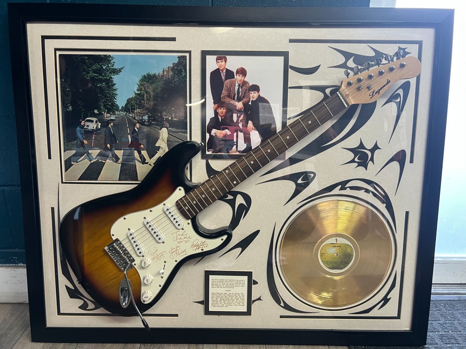 - HIGHLY collectible, 1 of 1 multi-instrument display containing The Beatles framed & etched/engraved signatures on Legends Guitar, with Gold Vinyl record/album of Abbey Road, along with images of The Beatles members themselves