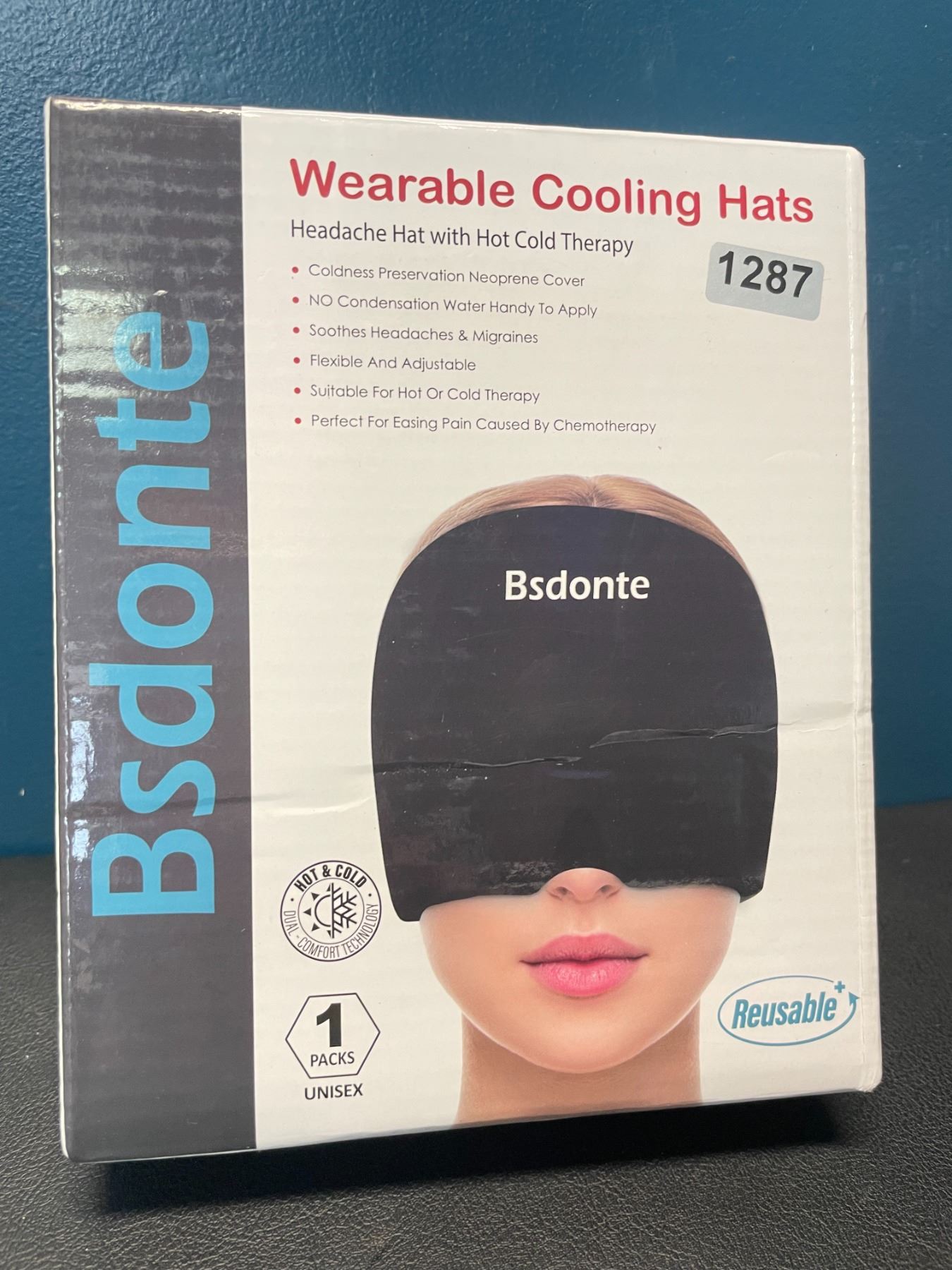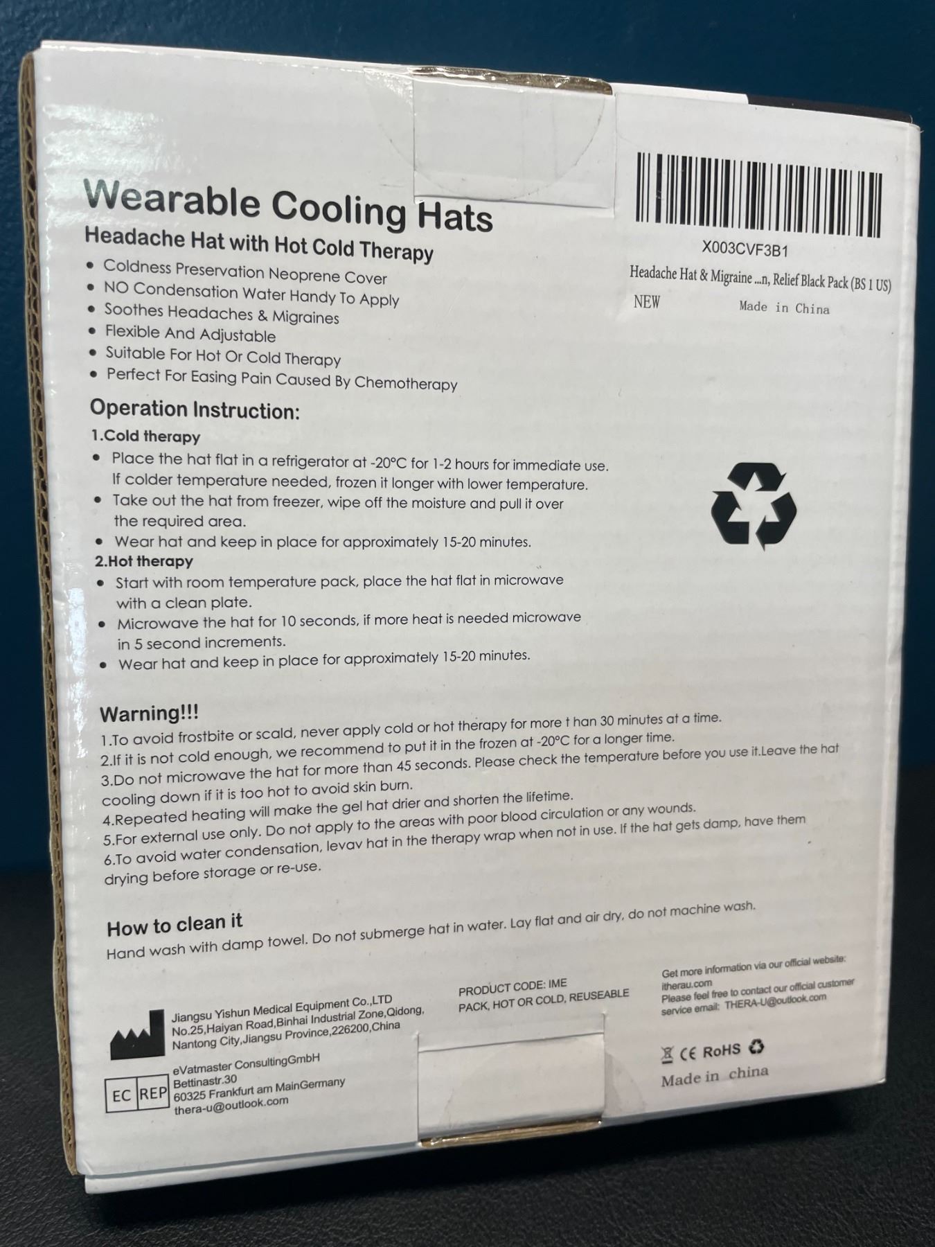 - headache relief hat/face mask with cot or cold therapy; place in fridge or place in microwave