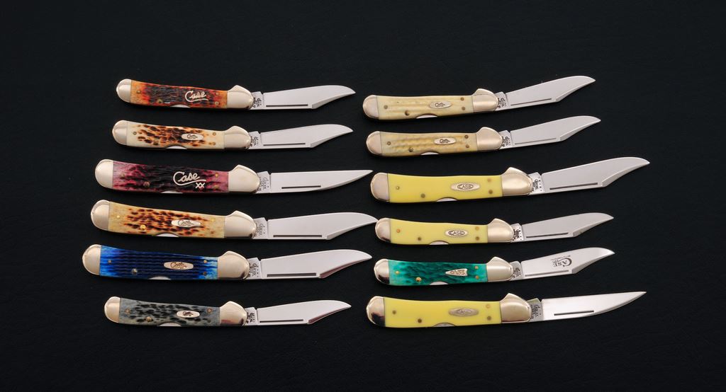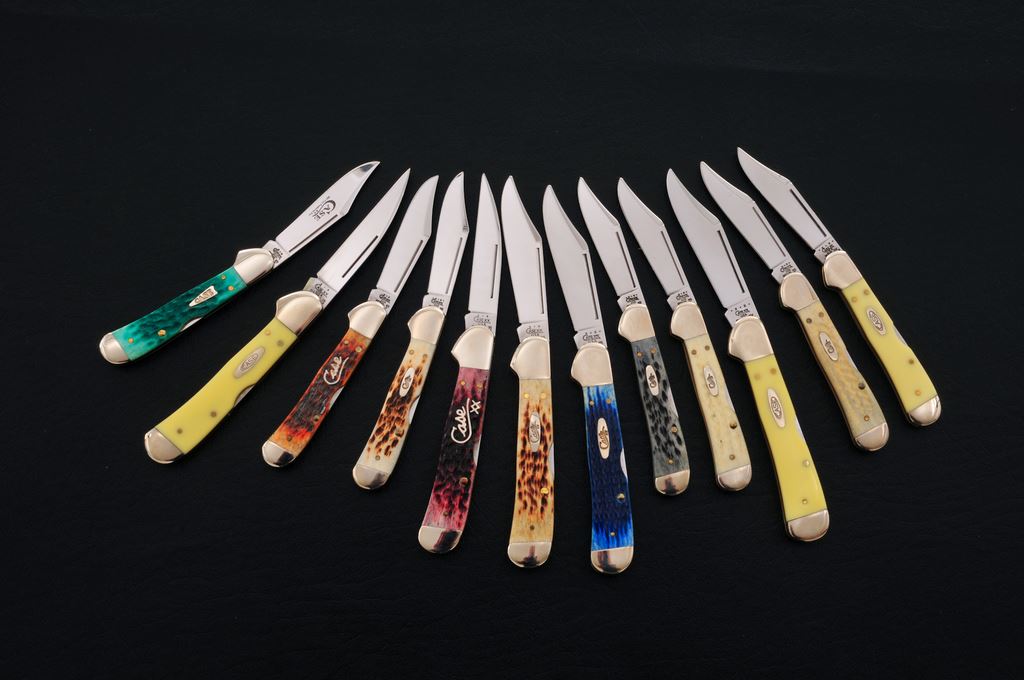 Lot of Twelve (12) New-in-the-Box Case ''Copperlock'' Folding Knives, including the following models and handle material: Model #31549L CV, #31549WL CV, and #31749L CVM, ''Chrome Vanadium'' knives, all with yellow composite handles; two (2) ''Pocket Worn'' knives, Model #61749L SS, black bone; and #61549L SS, antique bone. Also included in this lot are one each of the following: Model #61749L SS, natural bone; #61549L SS, blue bone; 61749L SS, Autumn bone; #61549WL SS, cranberry bone; #61749L SS, jade bone; #61749L SS, natural bone; and #61749L SS, with amber colored bone. Each knife comes in its original box with folding pamphlet and brown tissue paper. Mfg'd ca. 2000-2003. All are in excellent as new condition, never carried or sharpened. Est.: $300-$500/lot.