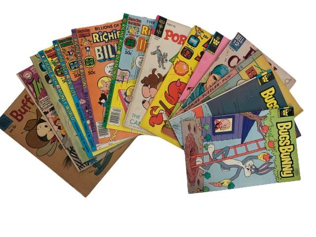 Lot of 14 vintage comics, all in worn condition. Titles include: Hot Stuff #98, July 1970, Casper #151, March 1979, Adventures of the Big Boy #168, 1971, Richie Rich #52, #40, #40, and #50, 1981. Also included is a Buffalo Bee #957, 1958, Bugs Bunny #231 and 232 ,1981, Porky Pig #37, 1971, Ben Casey #10, June to August 1965, The Inferior Five, a DC comic, #5 from November to December 1967, and Looney Tunes #37 from 1961. All are in worn condition.