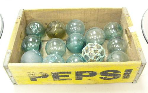 Lot of: 14 glass fishing buoys (average approx. size 3-1/2" diameter) in wooden Pepsi crate (2)