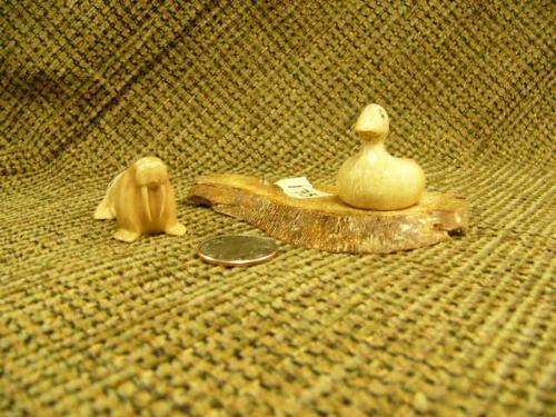 Lot of 2: Fossilized ivory walrus 1" and bone duck on bone base by Douglas V. 1.75" tall 4" wide (74)