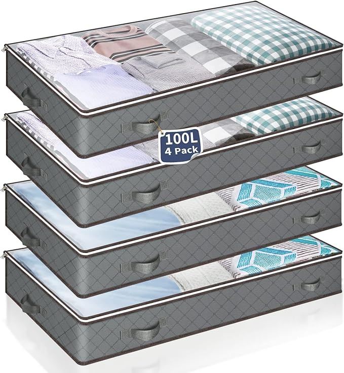 Under bed Storage Bags, 4 Pack 100L Underbed Storage Bags, Large Capacity Breathable Non-woven Under the Bed Storage Bins for Blankets, Pillows, Comforters and Quilts, Clothing, etc.
