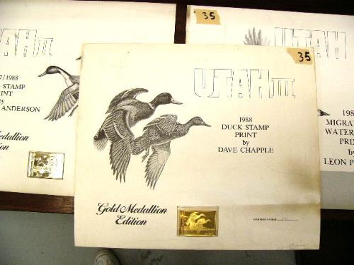Lot of 3: 1988 Utah Duck Stamp print by Dave Chappele print #571 Gold Medallion edition; 1986 Utah Migratory Waterfowl print by Leon Parson #591 Silver Medallion issue; 1987/1988 Utah Duck Stamp print by Arthur G. Anderson Gold Medallion issue #591 valued at $800 (37)