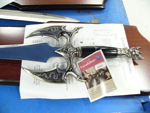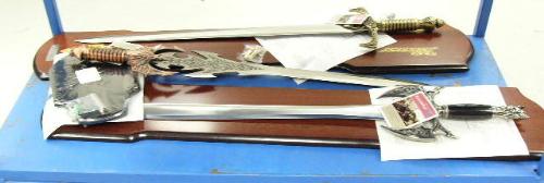 Lot of 3: Excalibur stainless steel blade, double edged, bronze to solid metal hilts, and with wood display plaques (8888)