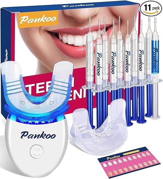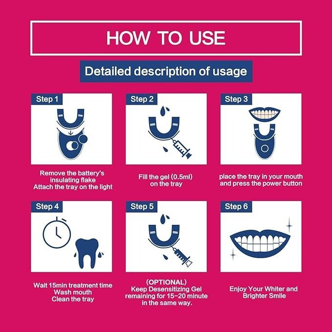- easy to use; simply apply whitening gel to mouth tray, press power button, and wait 15 mins; helps whiten teeth and remove stains