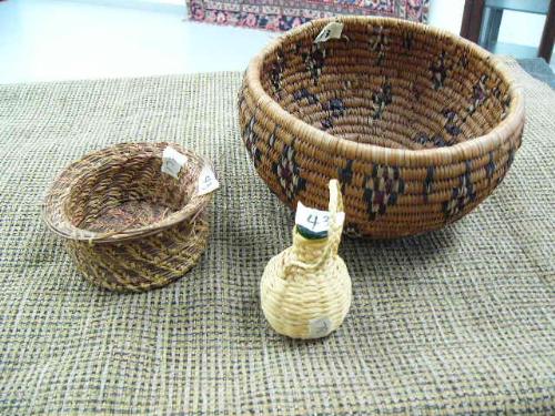 Lot of 3 baskets, one in need of repair, one around bottle, diamond design (178)