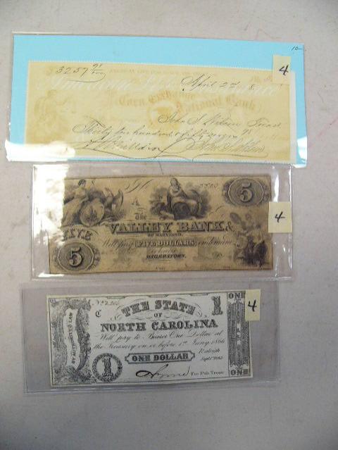 Lot of 3: check from the American Life and Insurance Trust Company 1868; $5 note from the Valley Bank of Maryland 1853, State of North Carolina $1 in 1862 (3)
