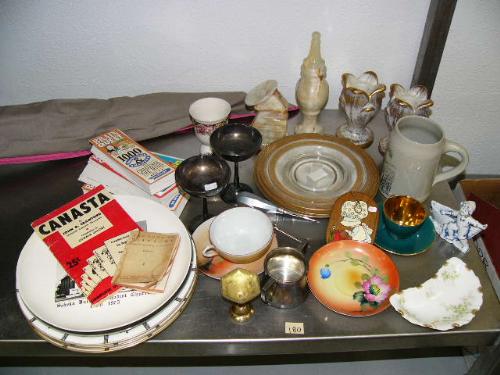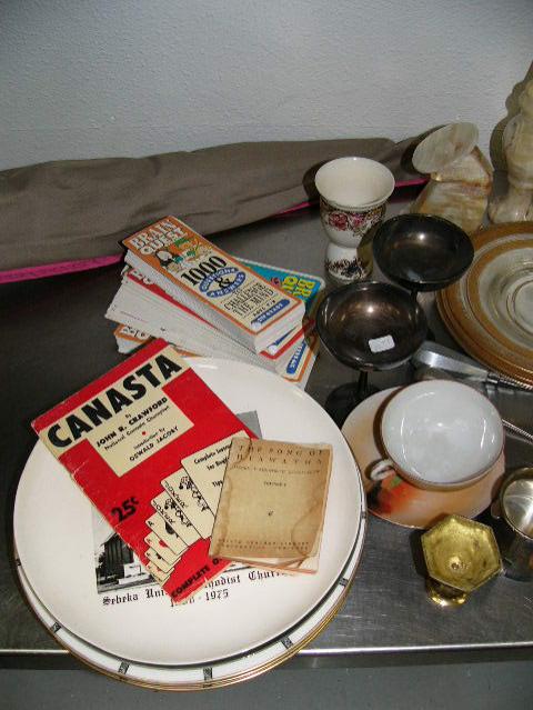 Lot of: 3 dinner plates; 2 "75th Anniversary Sebeka United Methodist Church 1900-1975" plates; 4 Brain Quest 100 Questions and Answers for grades 1 & 2; 2 candle holder; mug; etc. (2)