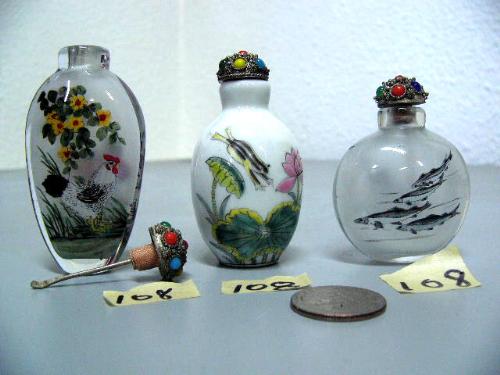 Lot of 3 snuff bottles: 1 China porcelain; 2 reverse glass painted from the inside (2)