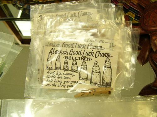 Lot of: 3 ulu knives, bad of glass beads, 4 small containers, 2 ivory hair pins, 6 ivory necklaces, 8 scrimshawed earrings, 7 hematite rings, 8 hematite bracelets, 3 hematite earrings, 19 bead necklaces, 8 lucky billiken, 6 Alaska note cards, 1 wood mask, 2 wood sea turtles, 2 Alaska pocket knives, 7 jade key chains, 19 multi-colored bead bracelets, 11 ivory billikens, 6 Alaska scrimshaw kits, 1 grass basket, 1 large round stone, 5 small round stones, 1 large green colored stone (33)