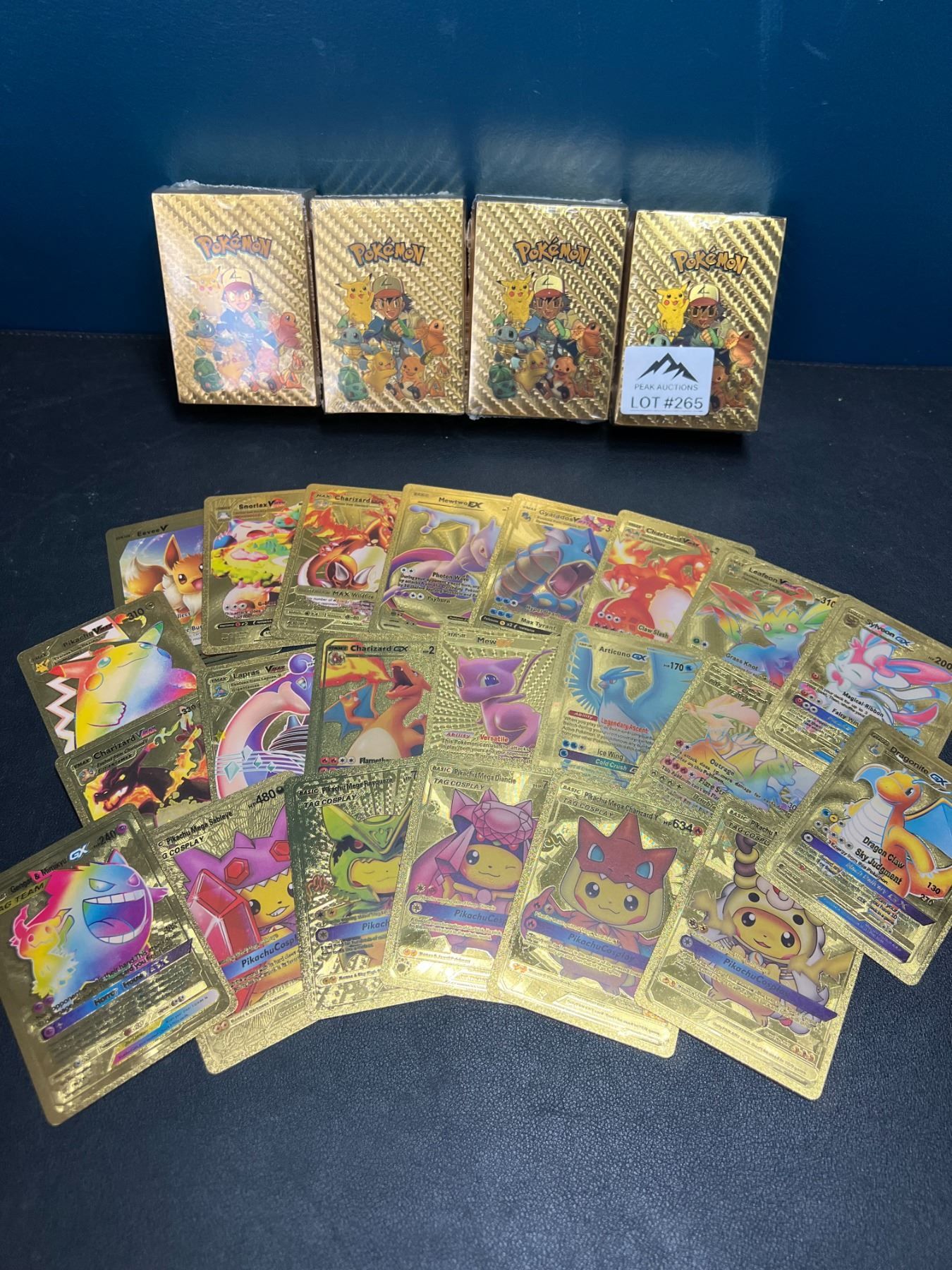 - gold foil fan art pokemon cards featuring many different pokemon; great for kids, not for collecting purposes