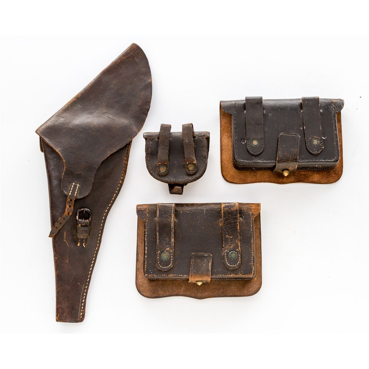 Lot of Four (4) U.S. Civil War Soldier's Items: Two (2) cartridge pouches, cap pouch, and cross-draw Cavalry flap holster for Colt 1860 Army or 1861 New Navy. All are in very good condition. Est.: $800-$1,200/lot.