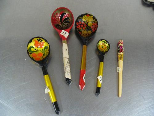Lot of 4 wooden Russian spoons and a wooden Russian stirrer