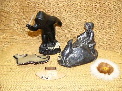 Lot of 5: 2 composite native style sculptures, wood ulu, fur face and beaded seal skin whale barrette (159)