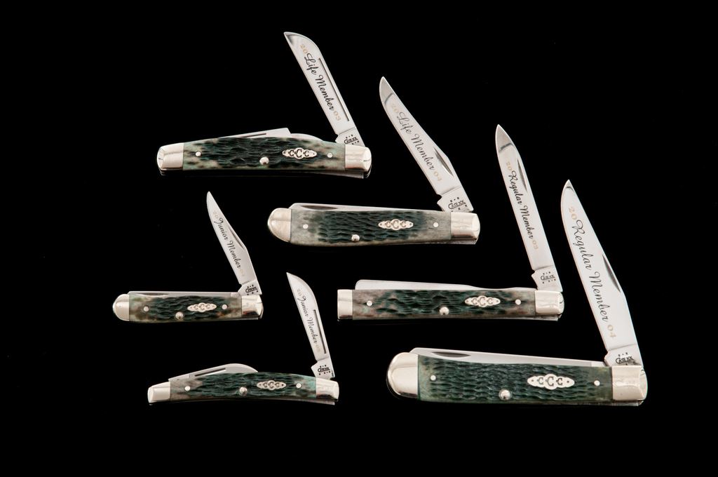 Lot of Six (6) 2003/2004 Case Collector's Club Knives for Junior, Regular, and Life Members, all are numbered ''L6116'' and include a #62154 SS ACK Tiny Trapper, junior member, dated 2004; #6268 SS ACK Small Congress, junior member, dated 2003; #6285-SP SS ACK Doctor's Knife, regular member, dated 2003; #6254 SS ACK Trapper, regular member, 2004; #64052 SS ACK Congress, life member, dated 2003; #6207 SS ACK Trapper, life member, dated 2004. Overall closed lengths range from 2-7/16'' to 4-1/8''. Each features ''Allegheny Mountain'' bone handles, with nickel silver ''CCC'' shield. Main blades are marked with the member rank and date. The knives are stored in a folding ''Case XX'' marked holder. All are in excellent as new condition, never carried or sharpened. Est.: $300-$400/lot.
