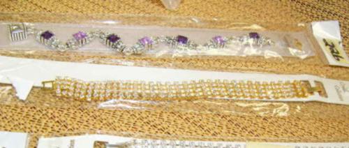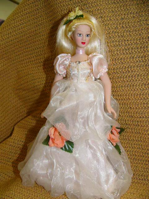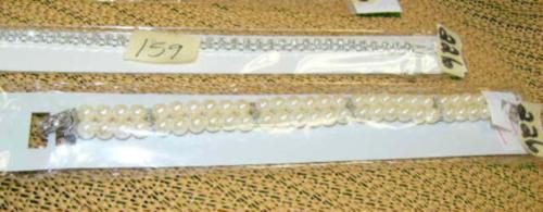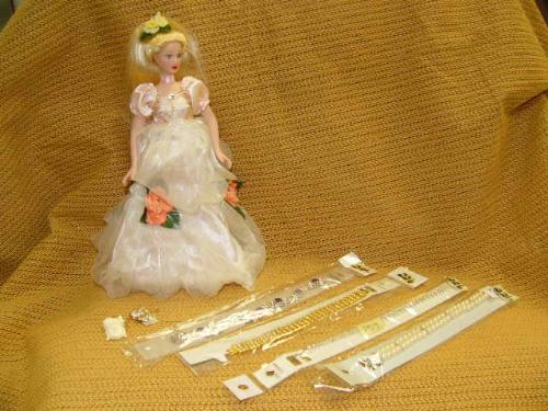 Lot of 6: 4 costume jewelry bracelet, ivory necklace on gold chain, collectable doll on stand with porcelain body (159)
