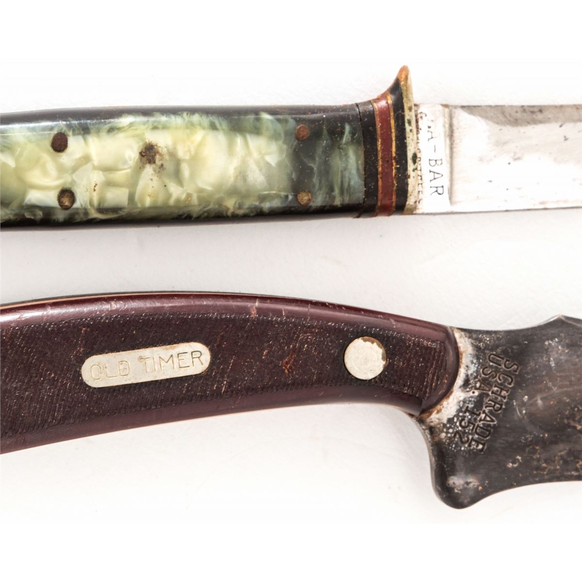 Lot of Six (6) Edged Weapons & Two (2) Skinning Sets, including: Cattaraugus 225Q fixed blade knife with leather sheath, previous owner's initials and date electro-penciled onto blade; Schrade ''Old Timer'' with leather sheath; small KA-BAR/Union Cut. Co. hunting knife with KA-BAR leather sheath; vintage Ranger hunting knife with leather sheath; Buck/Hoffritz #119A fixed blade hunting knife, with original Buck sheath; Gerber #6236 Folding Sportsman parts knife, missing lock back mechanism, with box and Gerber sheath; Browning RMEF edition two-knife hunting set, includes a caping and skinning knife with gut-hook; Browning RMEF edition field dressing set which includes a saw, gut-hook knife, and two different size skinning knives. Conditions range from poor to near excellent overall. Buck and Browning knives show signs of little to no use; remaining knives show moderate to heavy use and age. Est.: $150-$250/lot.