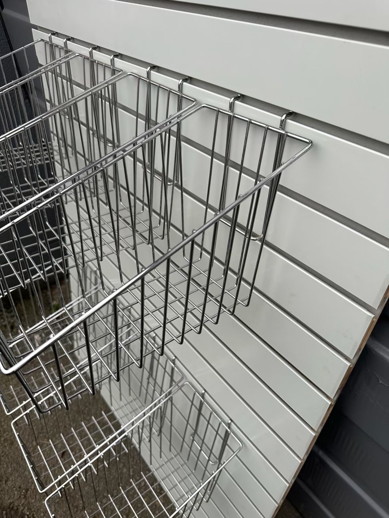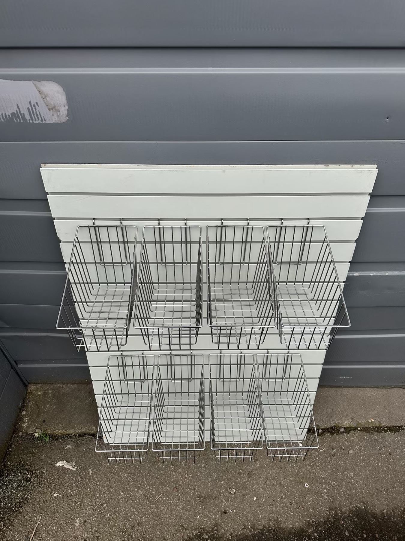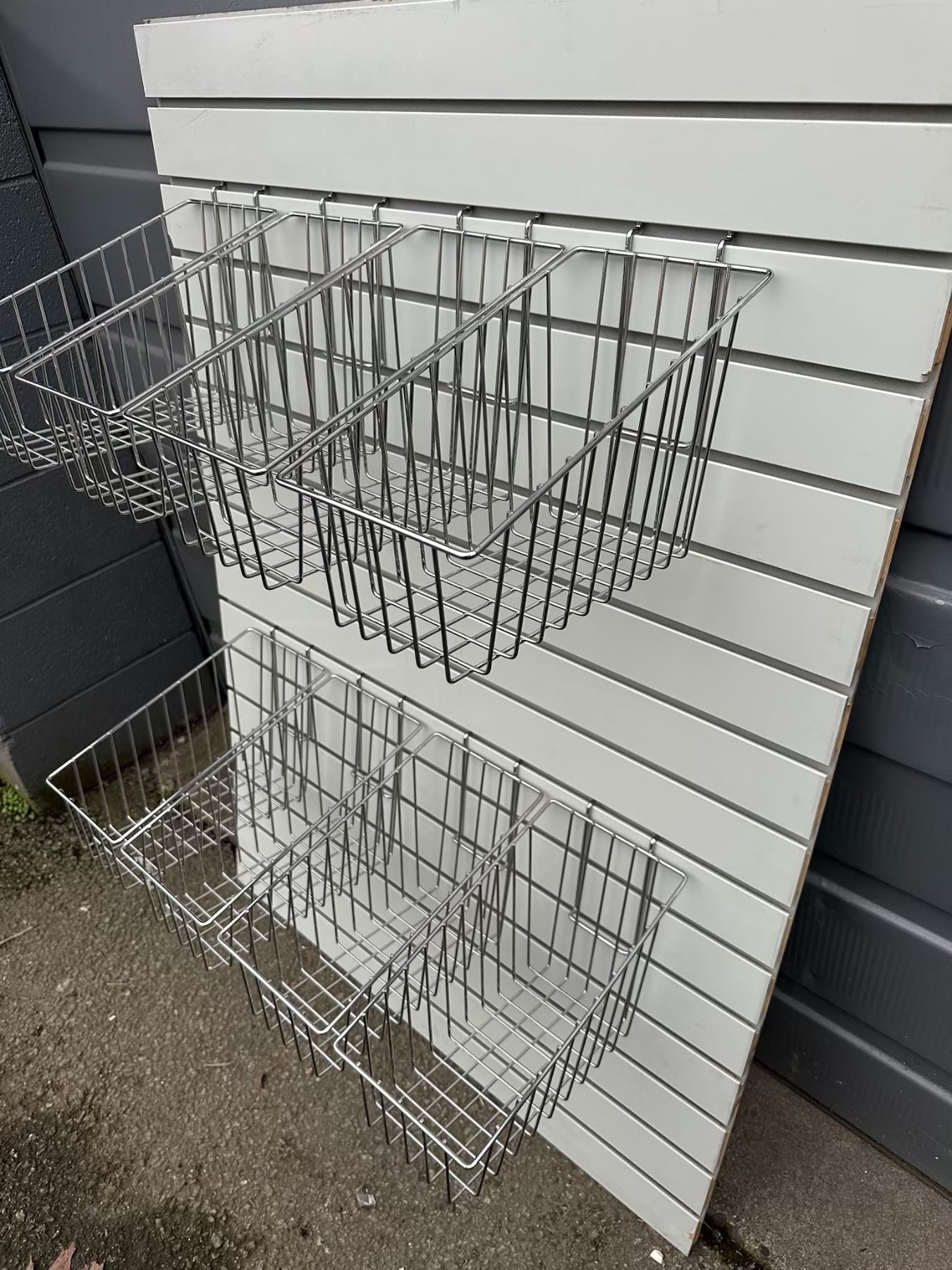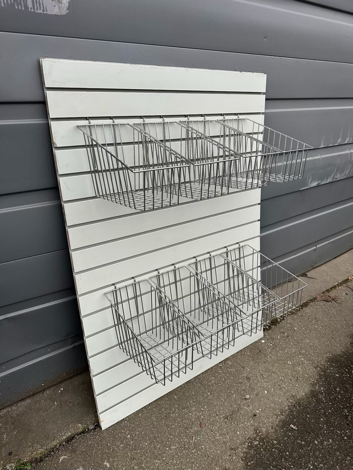 - includes what's shown; 8 metal mesh storage baskets and slat wall sheet (wall sheet size is 48" x 34.5")