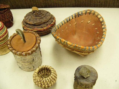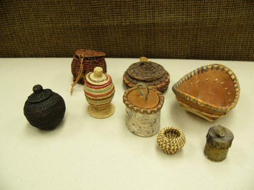 Lot of 8 baskets: Hooper bay, pine needle, 2 birch bark, black woven grass, miniature finish, miniature pine needle and salmon skin (214)
