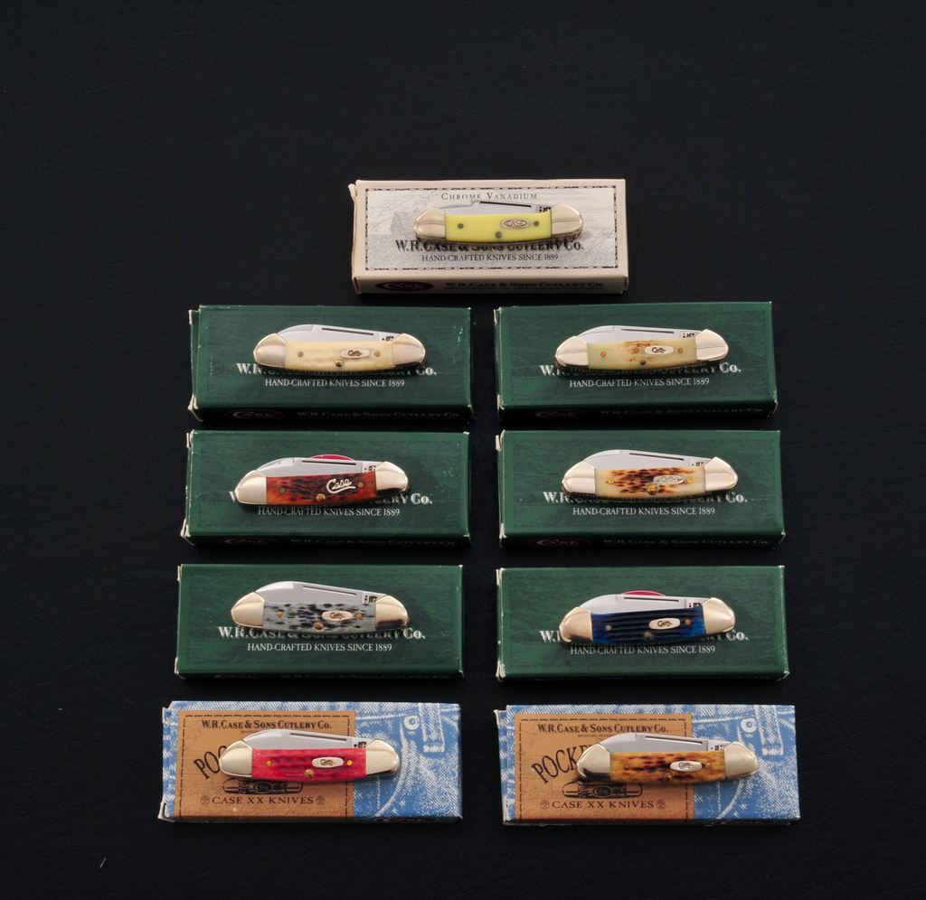 Lot of Nine (9) New-in-the-Box Case ''Baby Butterbean'' Folding Knives, including the following models and handle material: Model #32132 CV, Chrome Vanadium, yellow composite handle; two ''Pocket Worn'' knives, Model #62132 SS, antique bone; #62132 SS, old red bone. Also included in this lot are one each of the following: Model #V62132 SS, vintage bone; #62132 SS, natural bone; #62132 SS, black bone; #62132 SS, amber bone; #62132 SSM, blue bone; and #62132 SS, with Autumn colored bone handles. Each knife comes in its original box with folding pamphlet and brown tissue paper. Mfg'd ca. 2001-2003. All are in excellent as new condition, never carried or sharpened. Est.: $250-$450/lot.