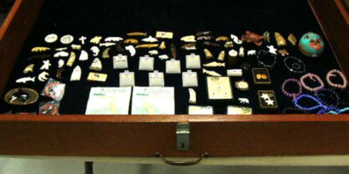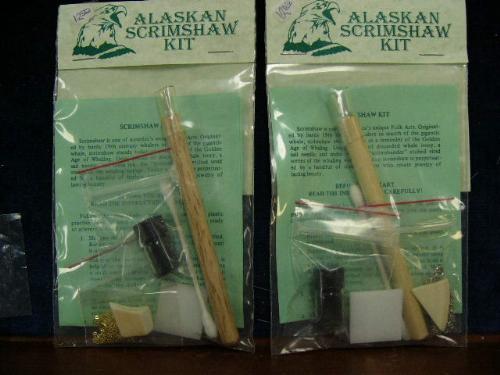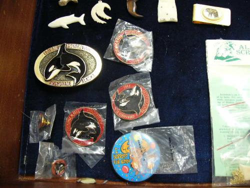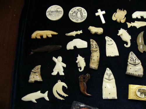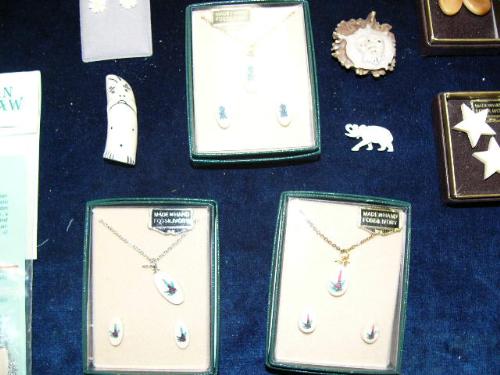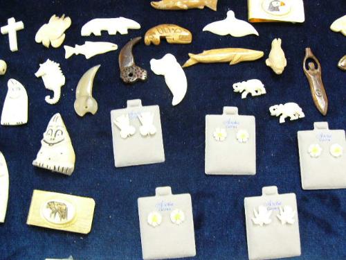 Lot of: '91 Fur Rondy memorabilia, 2 Alaska Scrimshaw kits, 9 pairs of earrings, 3 earring and necklace sets, bracelets and small carved animals, designs, billikens and more (33)