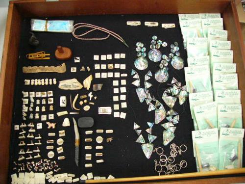Lot of: Alaskan Scrimshaw Kits, key chains, abalones necklaces strung with thin leather, 25 miniature ivory elephants, 20 miniature ivory bears, 3 ivory bases pocket knives scrimshawed, various ivory carvings, miscellaneous items (100)