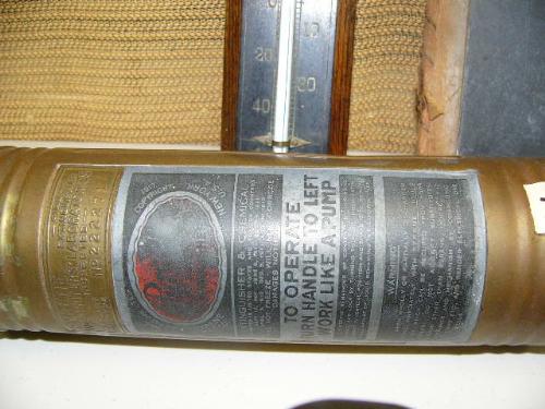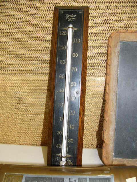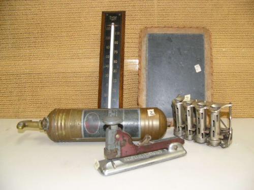 Lot of: Antique stapler, fire extinguisher, thermometer, coin changer, school house blackboard (194)