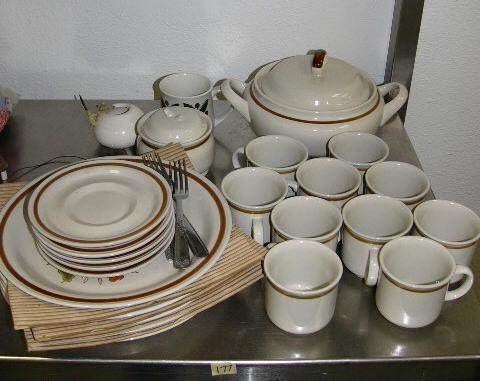 Lot of: Casserole dish with cover; 11 cups; 5 dinner plates; 5 saucers; sugar bowl; 3 spoons and 2 forks (2)