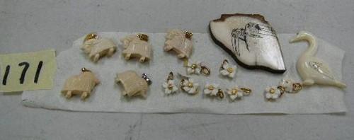 Lot of: Fossilized Mammoth Ivory / 6 Ivory/Gold Flowers/ 1 Bird Scrimshaw (555)