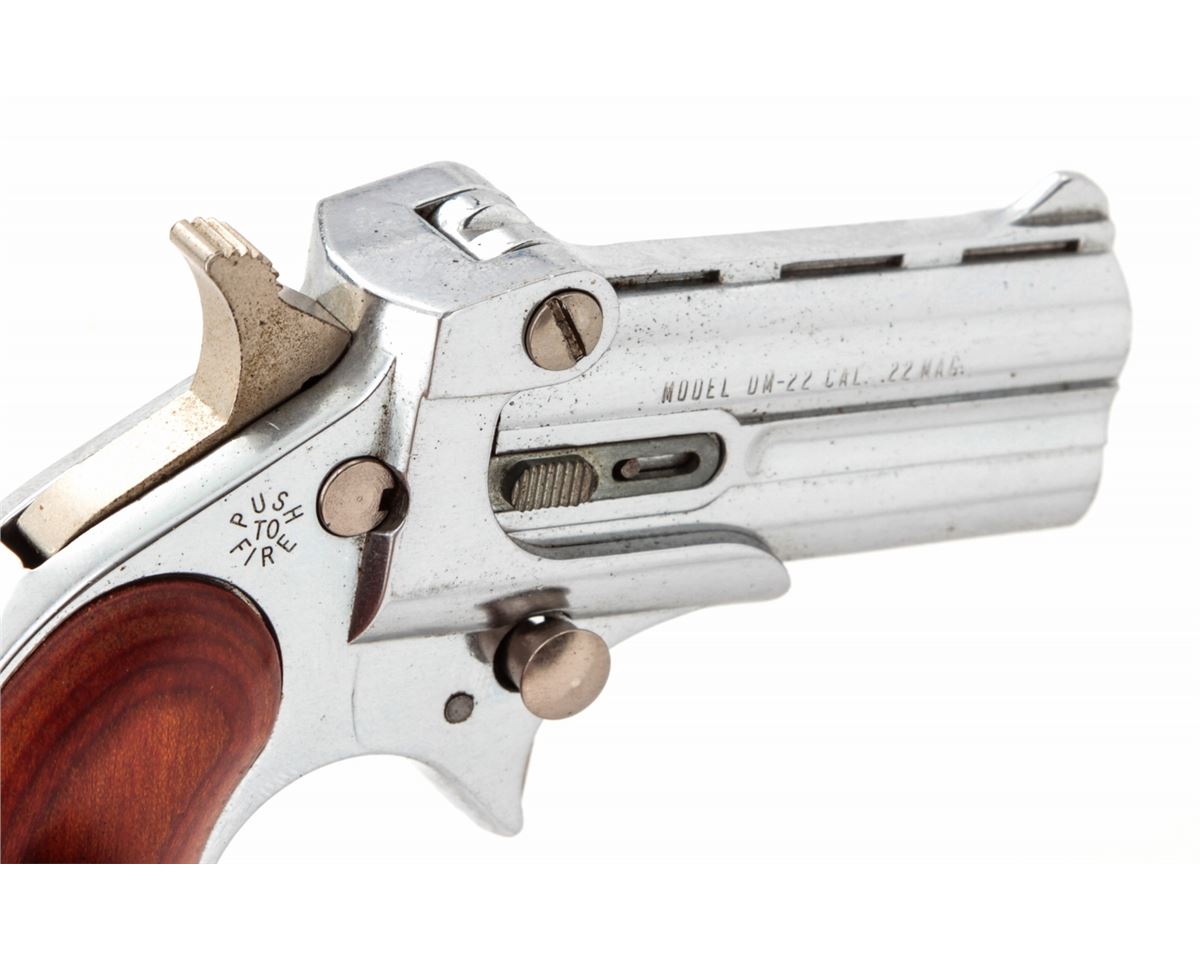 Lot of Four (4) Misc. Modern/C&R Project Guns: (1) Davis Model DM-22 Over/Under Derringer, #128916, .22 mag. cal., 2-1/4'' barrels, chrome finish, laminated wood grips. Condition is very good. Barrel latch needs repair. (2) Beretta Model 3032 Tomcat Semi-Automatic Pistol, #DAA085096, .32 ACP cal., 2-3/8'' barrel, matte finish, with checkered plastic grips and one magazine. Condition is good, appears to be complete but disassembled. (3) H&R 922 Double Action Revolver, #119997, .22 LR cal., 6'' barrel, blue finish, checkered walnut grips. Condition is fair retaining approx. 7% thinning and toning blue. Replacement front sight. Broken or missing trigger return spring, as well as several internal springs. Great for project or parts. (4) Single Shot Big Horn Arms Pistol, #000535, .22 Short cal., 7'' barrel, blue finish, molded simulated wood plastic grips. Condition is good, appearing complete, with broken plastic top rib. Est.: $225-$450/lot. (Modern)