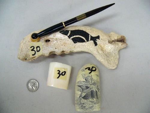 Lot of: Scrimshawed seal on Walrus Jawbone, Fake Whale Tool w/ whale hunting season, White Ivory Toothpick Holder (37)