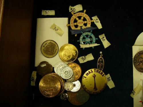 Lot of: Seattle Sea Fair pins 1958 and 1960, number of Seattle tax tokens, trade tokens etc (140)
