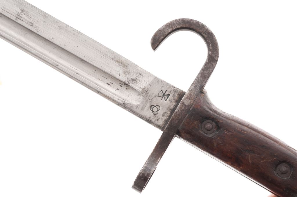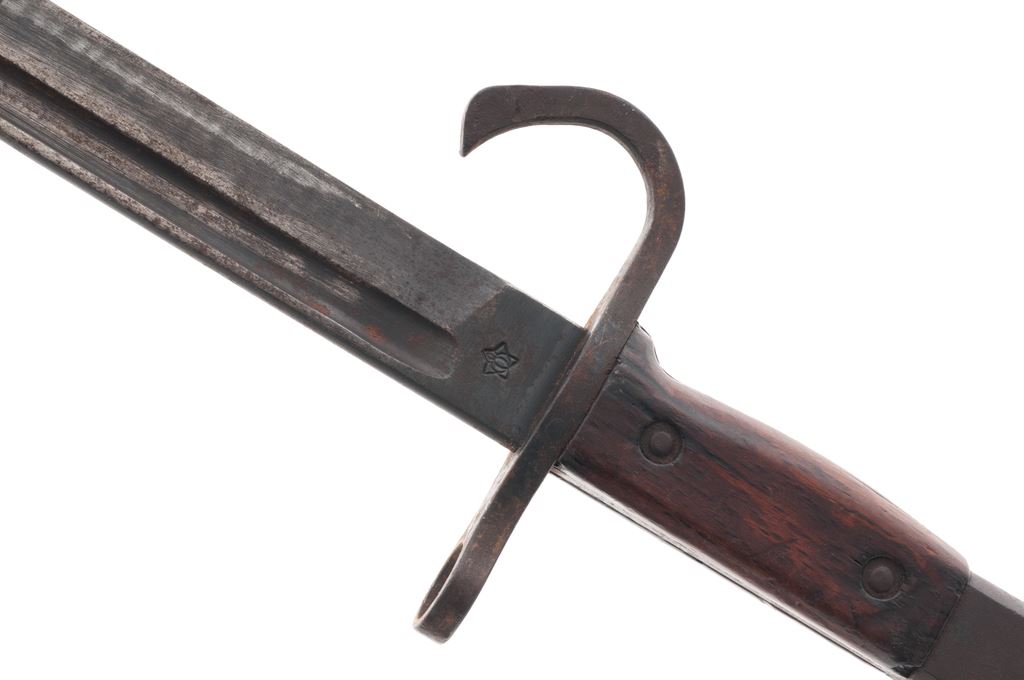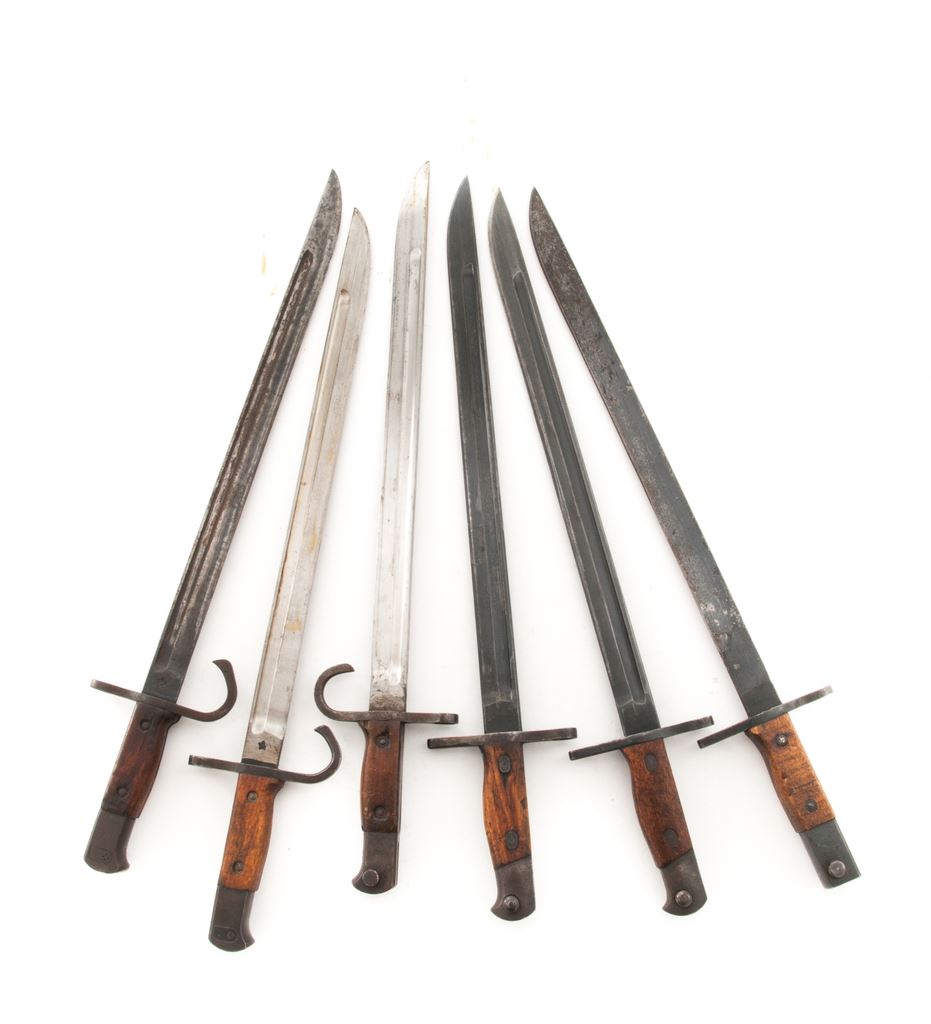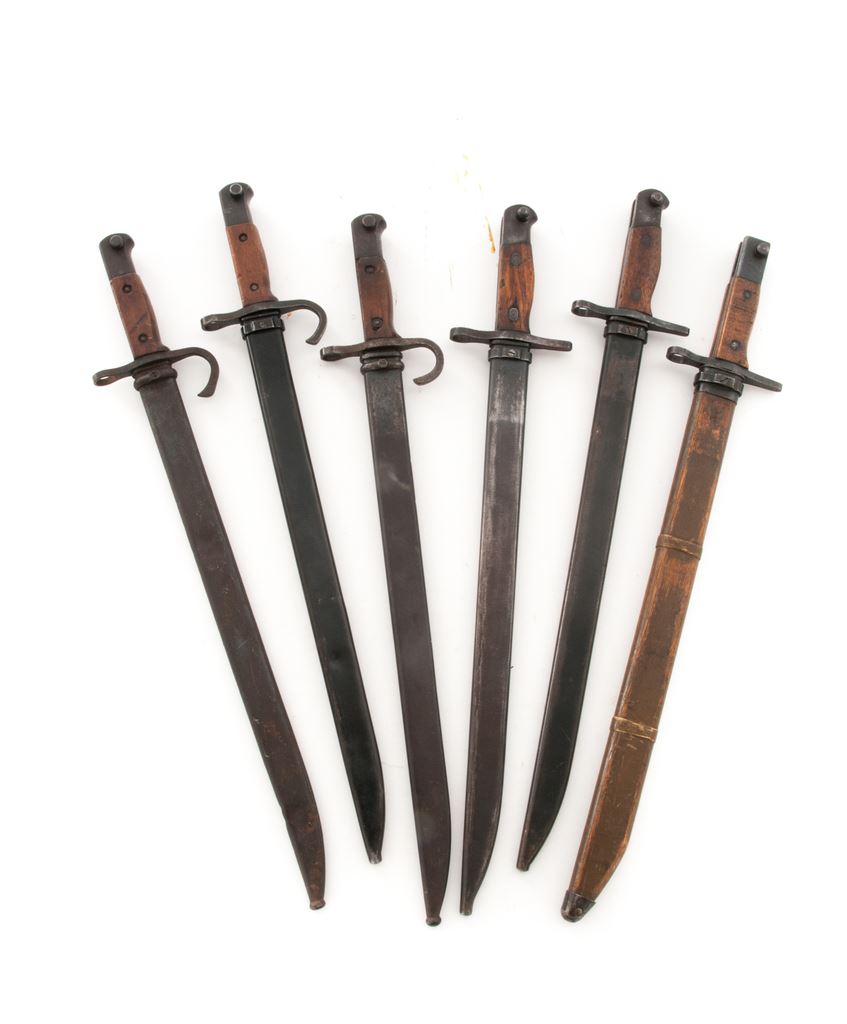 Lot of Six (6) Japanese Arisaka Bayonets: 1.) Toyada Automatic Loom Works Last Ditch, with square pommel, no quillion, and unfullered blade, in pointed wooden scabbard. Bayonet condition is very good with uneven sharpening to the blade and overall patina. Scabbard has some paint fading. 2.) Jinsen Rkugun Arsenal stamp, with round pommel, quillion, and fullered blade, in steel scabbard. Bayonet condition is good with nicks to blade, sharpening, and overall patina. Scabbard is fair with significant dents and surface rust. 3.) Toyada Automatic Loom Works, with round pommel, oblong grip nuts, no quillion, and fullered blade, in steel scabbard. Bayoent condition is very good with sharpening, nicks to blade, and patina. Scabbard is very good showing no dents and light patina and browning. 4.) Tokyo Hourglass stamp, with round pommel, quillion, and fullered blade, in steel scabbard. Bayonet condition is good with bright blade, light sharpening, and patina on handle area. Scabbard is very good with a couple of dents and overall patina. 5.) Jinsen Rkugun Arsenal stamp, with round pommel, quillion, and fullered blade, in steel scabbard. Bayonet condition is very good with light wear and bright blade except for tip which is dark on left side. Scabbard is fair with significant dents. 6.) Nagoya Diamond stamp, with round pommel, no quillion, and fullered blade, in steel scabbard. Bayonet condition is very good with sanded grips and light patina to pommel. Blued blade shows no nicks and a few small areas of patina. Scabbard is very good. All catches operate smoothly. Est.: $400-$600/lot.