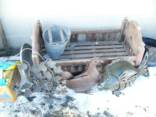 Lot of: antique baby cradle, canoe paddles, granite wear, Pegasus, plant stand, lamps, old leather suitcases, tool boxes, chainsaw, hand logging equipment, old wood boxes, vintage bike, entry way bench, motorcycle helmets, etc. (2)