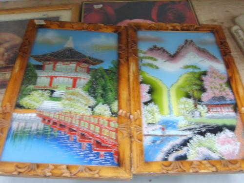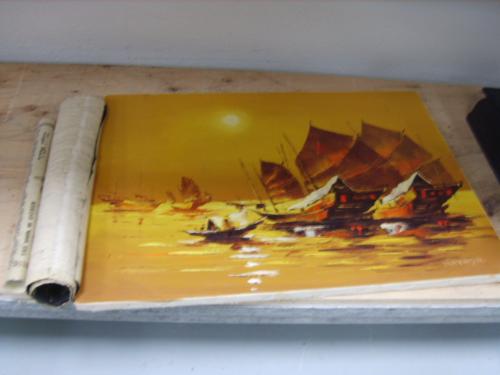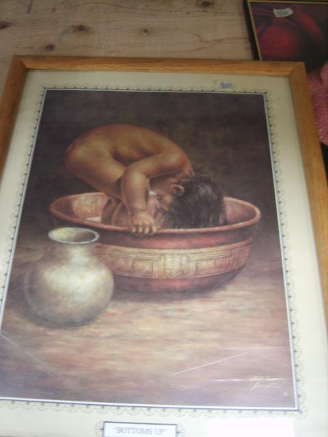 Lot of artwork, including "Bottoms Up" by. Bill Hampton, 2 framed pieces of oriental artwork, Oil painting by. Nakada, 2 scrolls, and a framed rose picture (269)