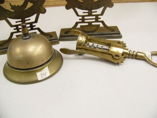 Lot of brass corkscrew, hotel desk bell and 2 brass book ends (194)