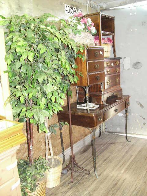 Lot of: iron legged desk and night stand; 2 artificial plants; pole lamp; couple of end tables (42)