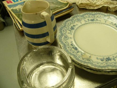 Lot of: lace, linen, shot gun lighter, cut glass ashtray, etc. (2)