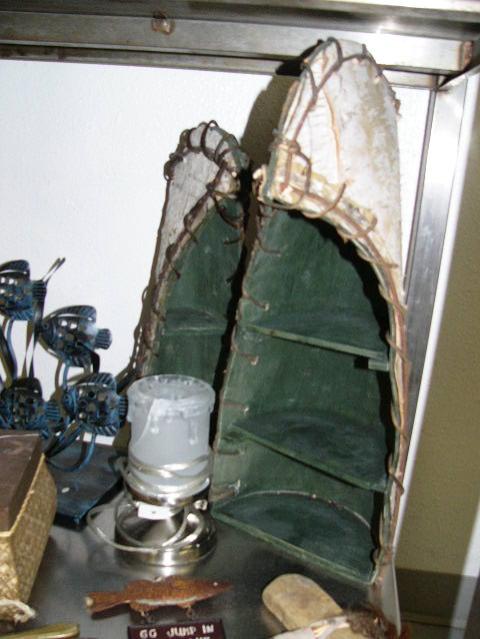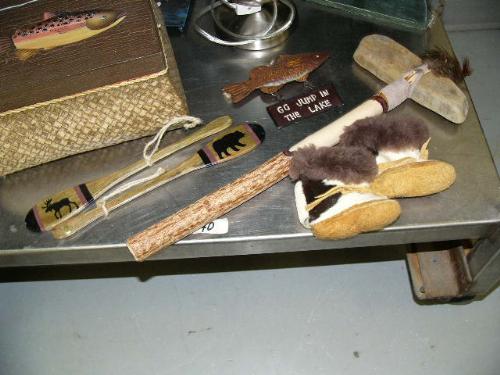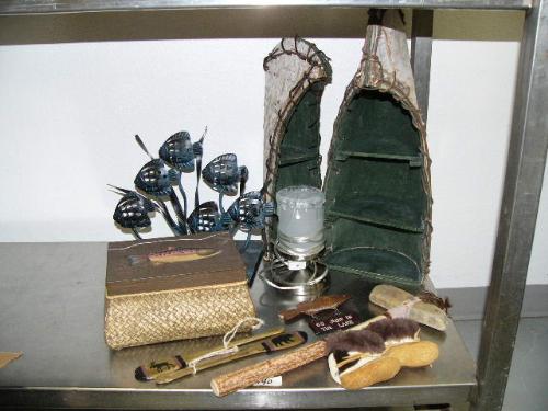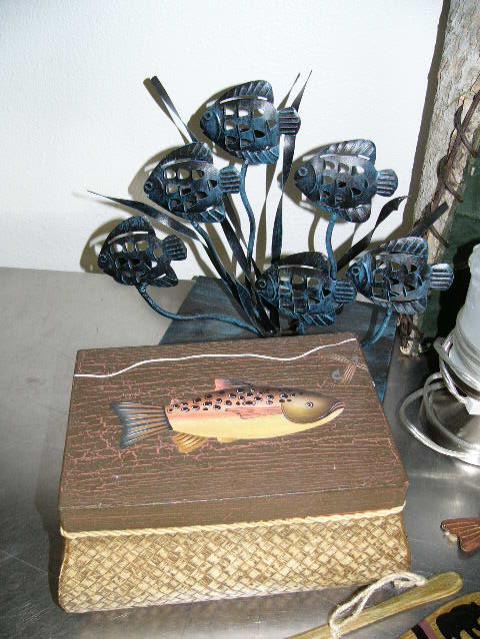 Lot of: metal fish sculture with six tropical fish, fisherman's keepsake box with fish design on lid, birch canoe display stands or shelves, portable lamp, "Go Jump In The Lake" fish sign, pair of canoe oars- moose and bear designs, small pair of mukluks, Indians style hatchet/axe (104)