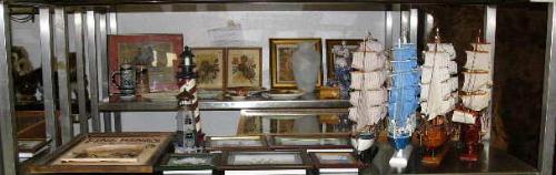 Lot of nautical decorations: Wood ships, lighthouses, framed knives, butterflies, ships and shells, wine sign (8888)
