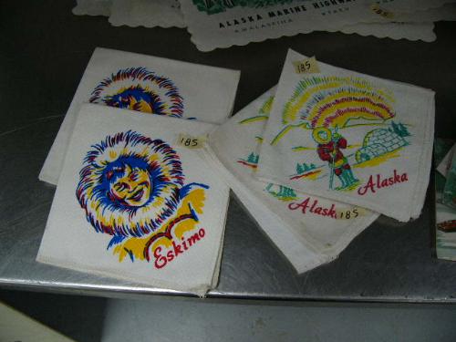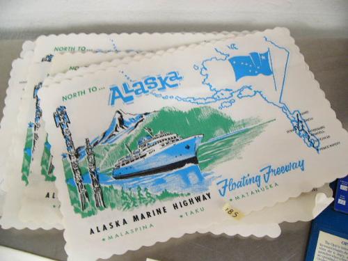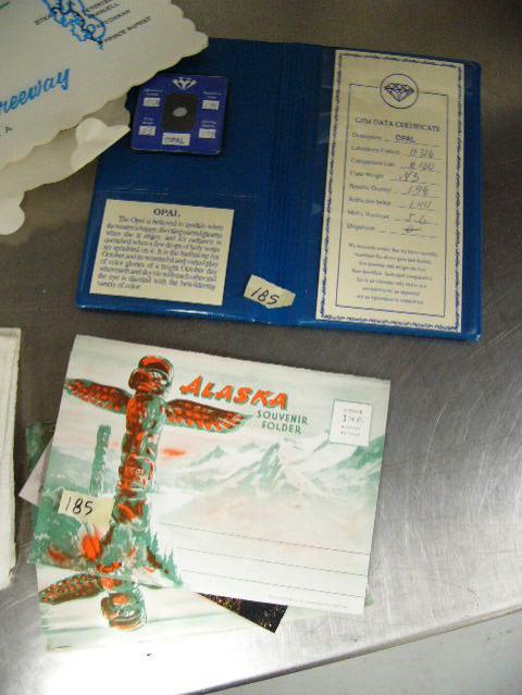 Lot of: old Alaska linen napkins, postcards, place mats, opal gem stone