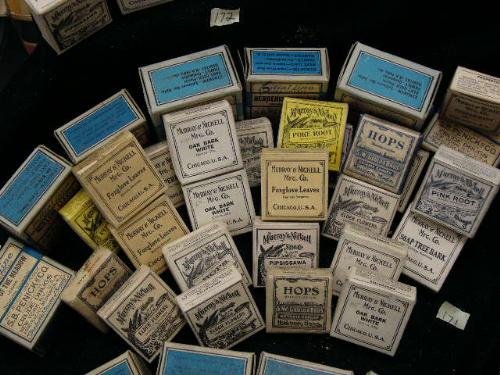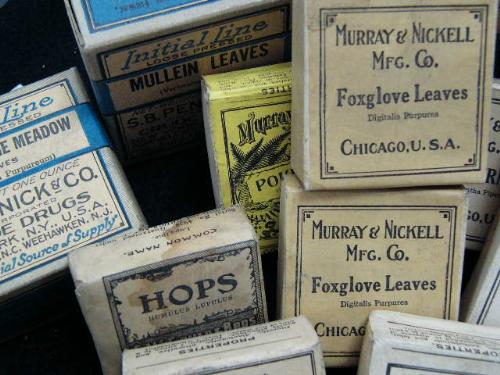 Lot of old herbs in medicinal boxes at least 50 boxes: including- Hops, Queen of the Meadow, Elder Flowers, Oak Bark, Oak Root, Foxglove Leaves, Pink Root, Penny Royal (88)