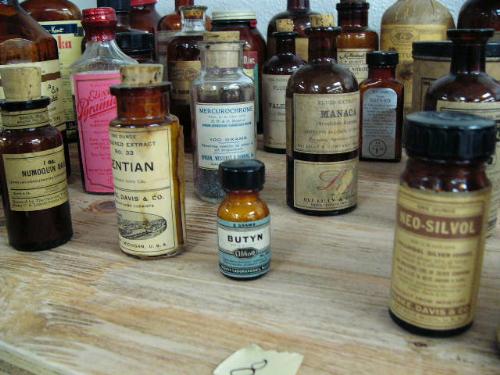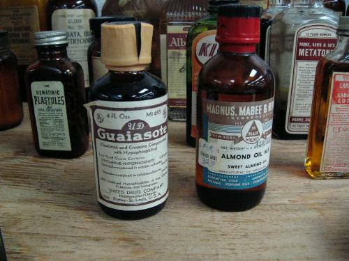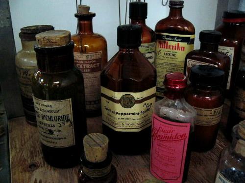 Lot of old medicinal bottles many with corks and screw tops some with original Seward Drug Store labels: including- Spirit of Peppermint Squibb, Elixir Pepsin Bismuth and Strychnine, Lark Spur lotion, almond oil, Plastules with liver concentrate, Pan-Peptic elixir, Cotton root bark, tablet 66, sodium acid phosphate, silver nitrate crystals, oil rosemary flowers and many more (88)