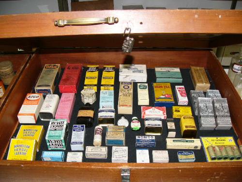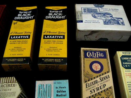 Lot of old medicinal boxes and tins: including- old fly catcher strips, fig syrup, herbal tea, stomach tonic, herbal laxatives, ointments, and many more (88)