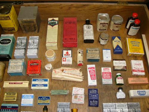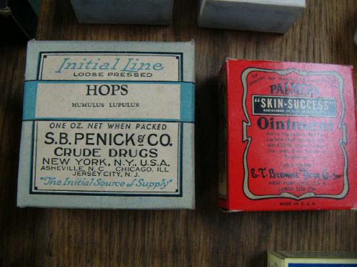 Lot of old medicinal boxes, bottles, tins, and jars: including- Hops, Malt, 4-Way cold tablets, denture adhesive, Quanine Phosphate, Spohnes Compounds for horses-mules-dogs-cattle, stomach tonic, Dr. Miles pain pills (88)