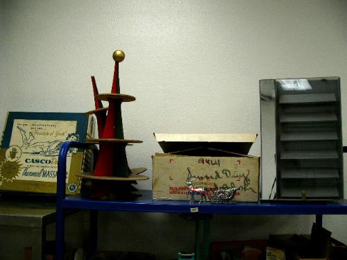 Lot of: old thermal massager, 2 wooden Christmas trees 23" tall, 1 Christmas tree stand, rotating display box 18" tall & 12" wide and deep (88)