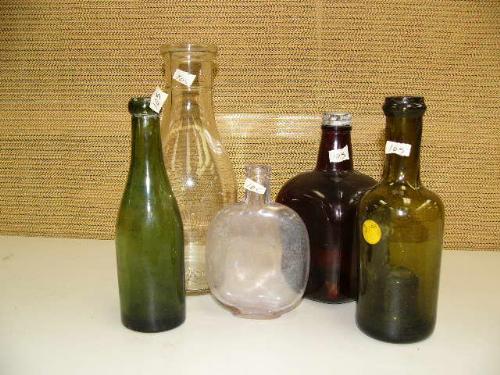 Lot of: pumpkin seen flask, milk bottle and 3 old bottles (194)