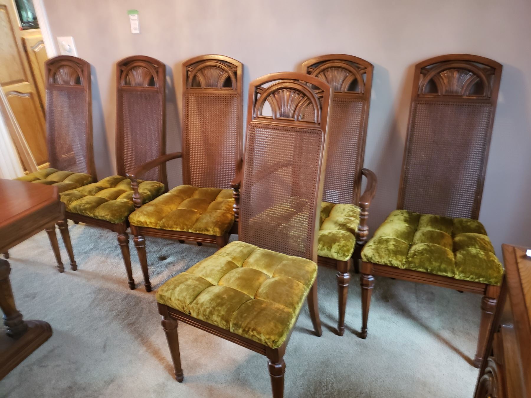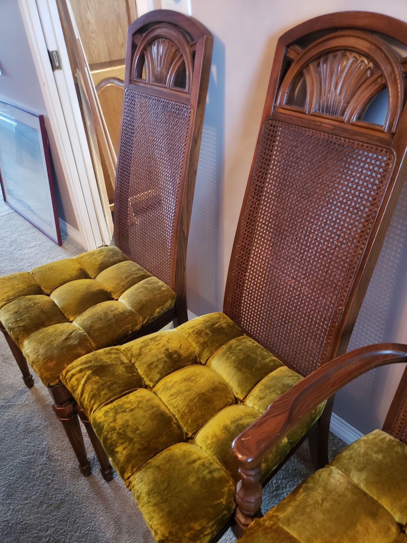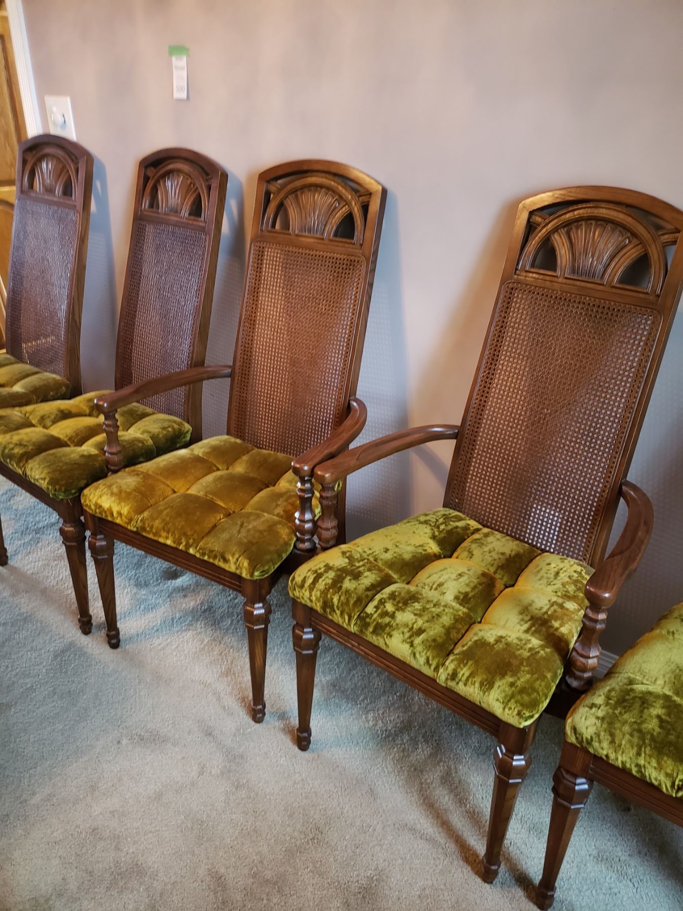 6 wood dining chairs with attached green cushions. Minor wear to some of the wood. 28x19x45” each pickup from 10-11am