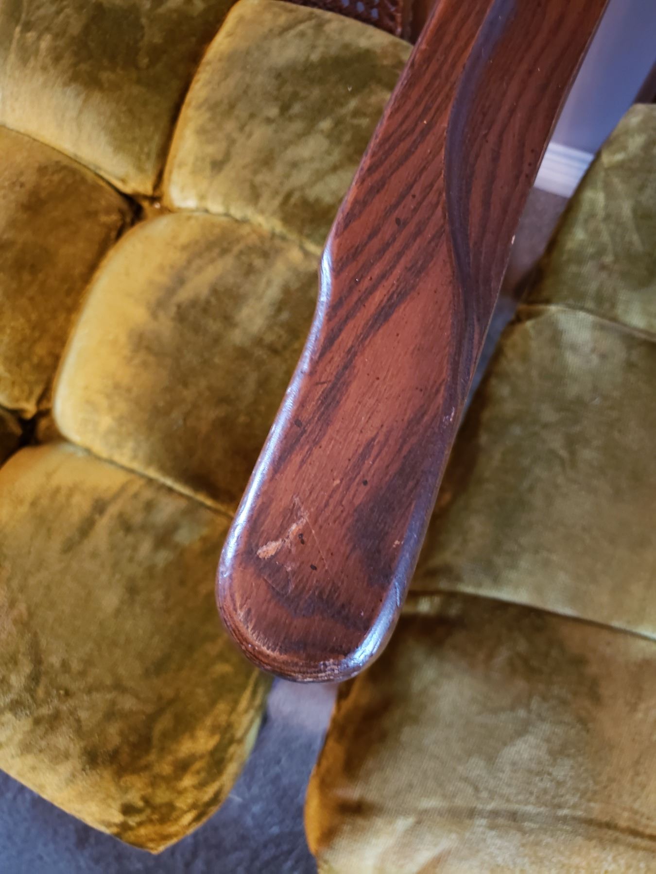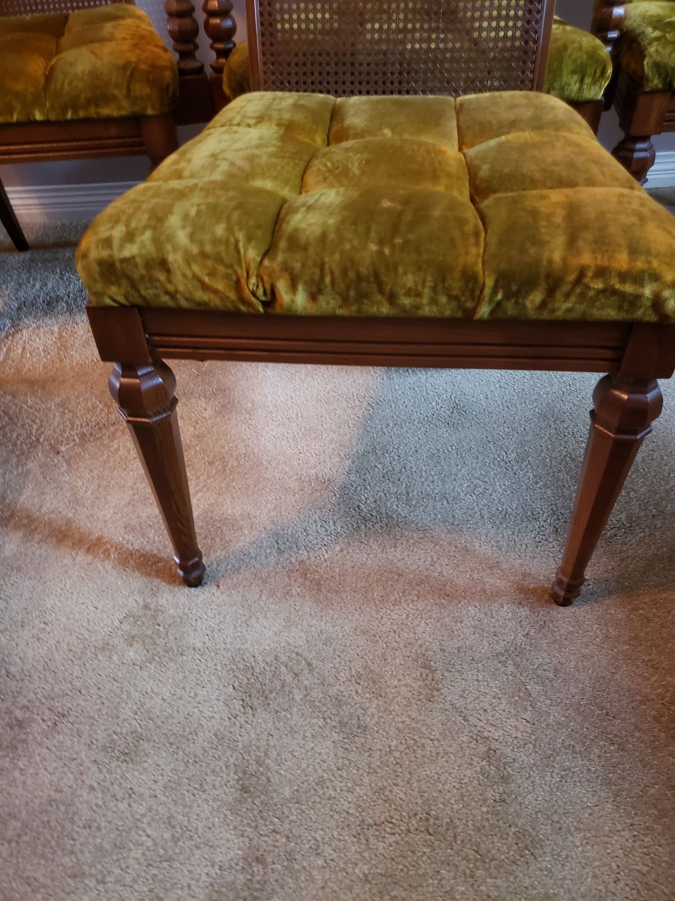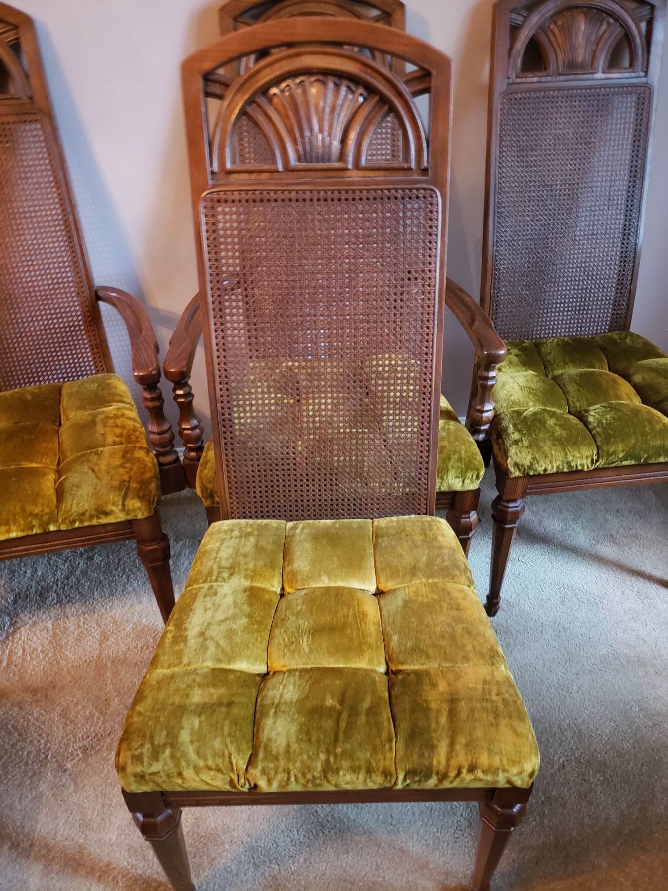 6 wood dining chairs with attached green cushions. Minor wear to some of the wood. 28x19x45” each pickup from 10-11am